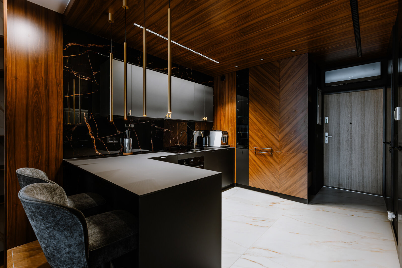 Na powierzchni 50 m² czeka na Ciebie wnętrze premium wykończone w drewnie, z klimatycznymi tapetami i najwyższej klasy wyposażeniem, zapewnia pełną wygodę dzięki: